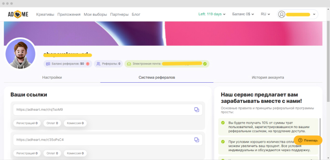 - Find you unique referral link and use it to authorization new users in Adheart or create extra links for different traffic sources